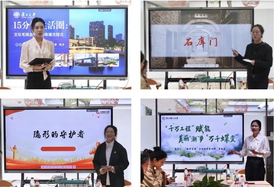 会上,复旦大学“星火”党员志愿服务队副队长陈婉金、博士生讲习团副团长孝泽慧、“红研青锋”硕博宣讲团团长陈子帆、红信讲习团团长樊怡婷分别介绍了团队在组织架构、宣讲模式、实践成果等方面的扎实成效和特色。