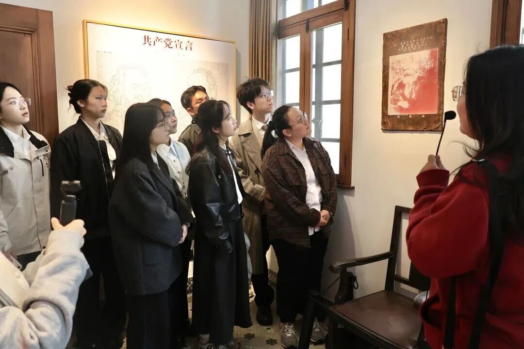 当日,浙江理工大学师生还在复旦大学“星火”党员志愿服务队宣讲员王一婷的带领下,一同参访了《共产党宣言》展示馆,聆听了“真理的味道非常甜”的典故,重温了陈望道先生翻译《共产党宣言》首部中文全译本的初心故事。师生透过丰富展陈,共同感悟了宣言精神穿越百年的真理力量与时代价值。