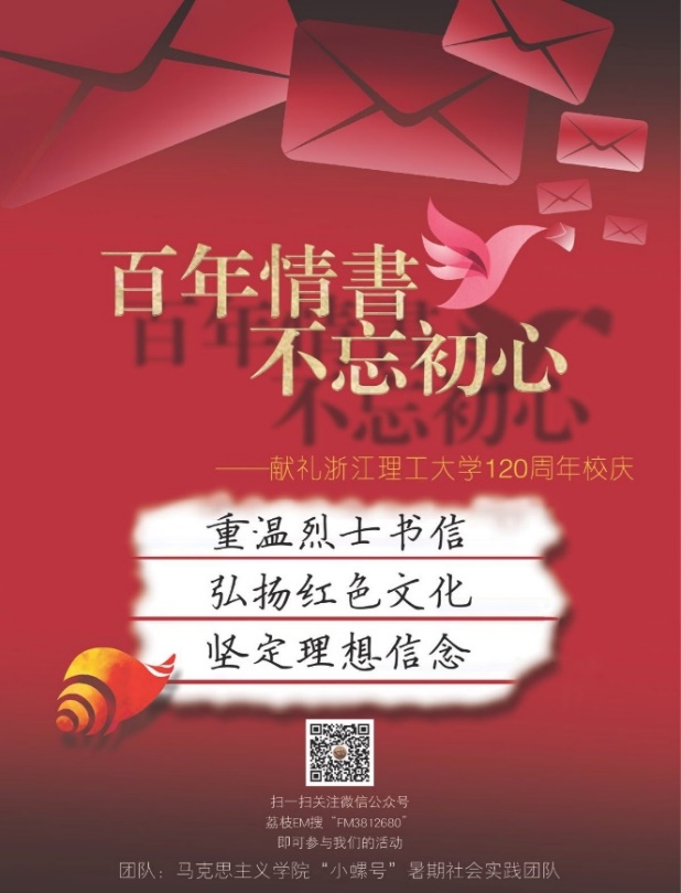 为喜迎十九大,继承红色基因、弘扬红色精神、传承红色文化,进一步推进我校红色文化研究与实践事业,浙江理工大学马克思主义学院师生从7月开始,以大学生暑期社会实践为依托,开展以“百年情书,不忘初心”为主题的颂读革命烈士书信活动。