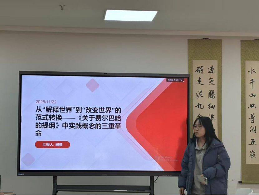 田雅同学分享《关于费尔巴哈的提纲》,梳理了其作为马克思主义哲学纲领性文件的定位、写作背景与文本结构,核心解读实践概念引发的认识论、本体论、方法论三重革命,点明其“从解释世界到改变世界”的范式转换意义。田雅同学指出,该书以实践为核心超越旧哲学局限,确立真理的实践标准与哲学的变革使命,彰显出强大理论生命力。