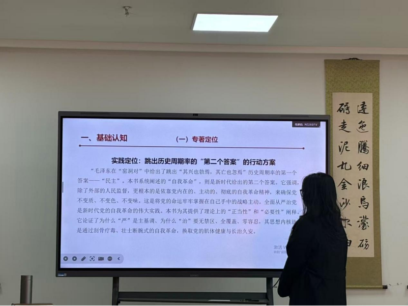 蒋思晗同学分享了《论党的自我革命》,她指出该书给出了跳出历史周期率的第二个答案——自我革命,与人民监督形成内外合力,确保党不变质不变色不变味。她感慨“自我革命”这不是宏大空话,而是党直面难题、刀刃向内的实在智慧,党的强大源于持续自我净化完善。这也启发个人,需秉持反思纠错的自觉,方能不断成长、行稳致远。