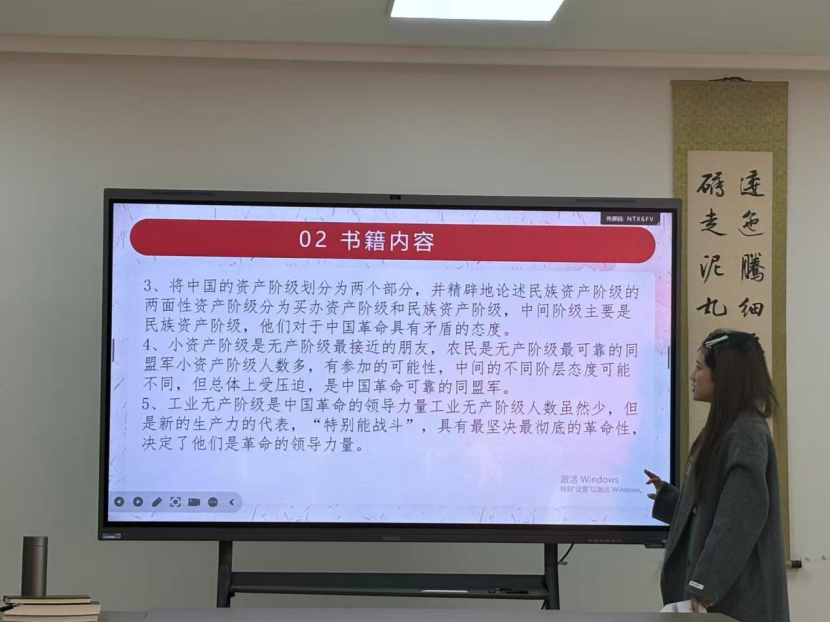 周叶湫同学分享了《中国社会各阶级的分析》,介绍了国共合作时期的写作背景,阐述了“分清敌友是革命首要问题”的核心,分析了五大阶级的政治立场,尤其注重从动态变化中把握他们的态度,从而清晰划分了敌我的界限。周叶湫同学指出,该文的阶级分析法极具穿透力,立足国情划清革命界限、指明方向,启示新时代青年需以发展眼光看问题,坚持理论联系实际、与时俱进,从经典中汲取智慧。