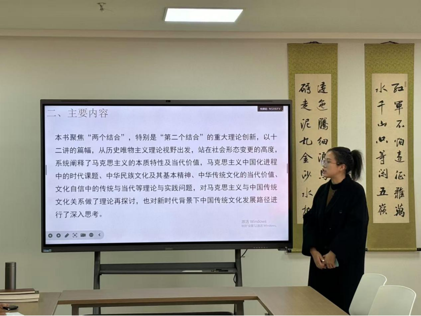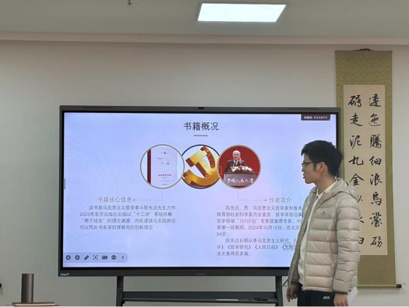 李茂森同学分享了《“两个结合”十二讲》,介绍了该书的核心信息、四重核心内容与三大关键观点,阐述了其在社会治理、文化强国等领域的现实意义与实践价值。他认为,该书打破了对“两个结合”的碎片化认知,纠正了“外在适配”的研究误区,能够让我们明晰二者深层融通的本质与递进逻辑。李茂森同学指出,在未来将以书中的辩证思维为指引,结合基层治理、文化传播的实证案例,进一步探究“两个结合”的微观实践机制,让学术更具有现实意义。