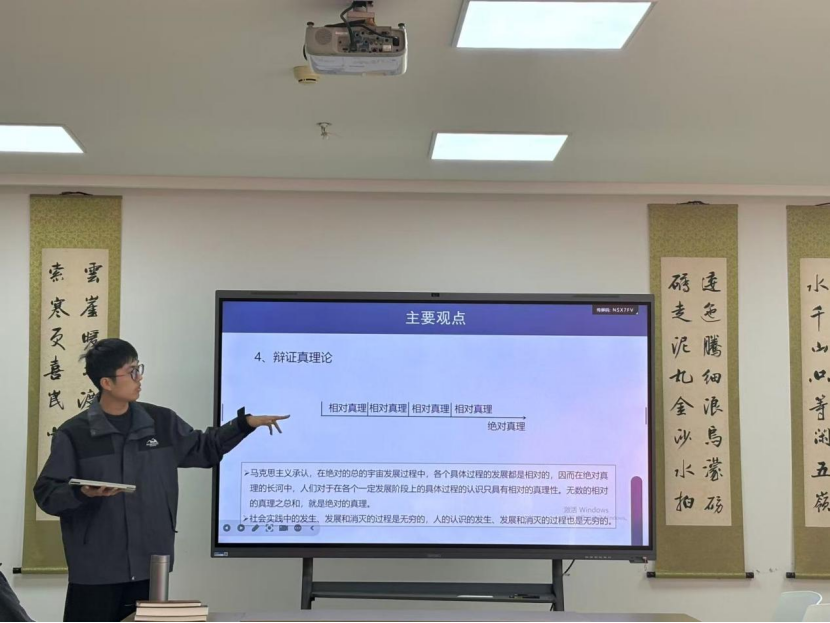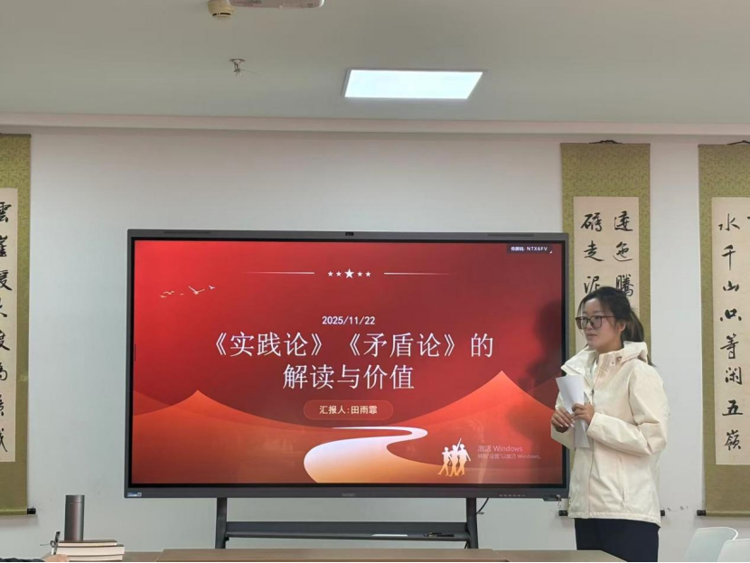 田雨霏同学分享了《实践论》《矛盾论》,介绍其诞生背景,阐释《实践论》中认识与实践的辩证关系、《矛盾论》的矛盾学说,点明“两论”的时代价值与当代启示。她强调,“两论”是理论瑰宝,能够让我们明白真知源于实践、矛盾是发展动力,其辩证思维与实践导向,对学习、社会观察和个人成长均有深刻指导意义。