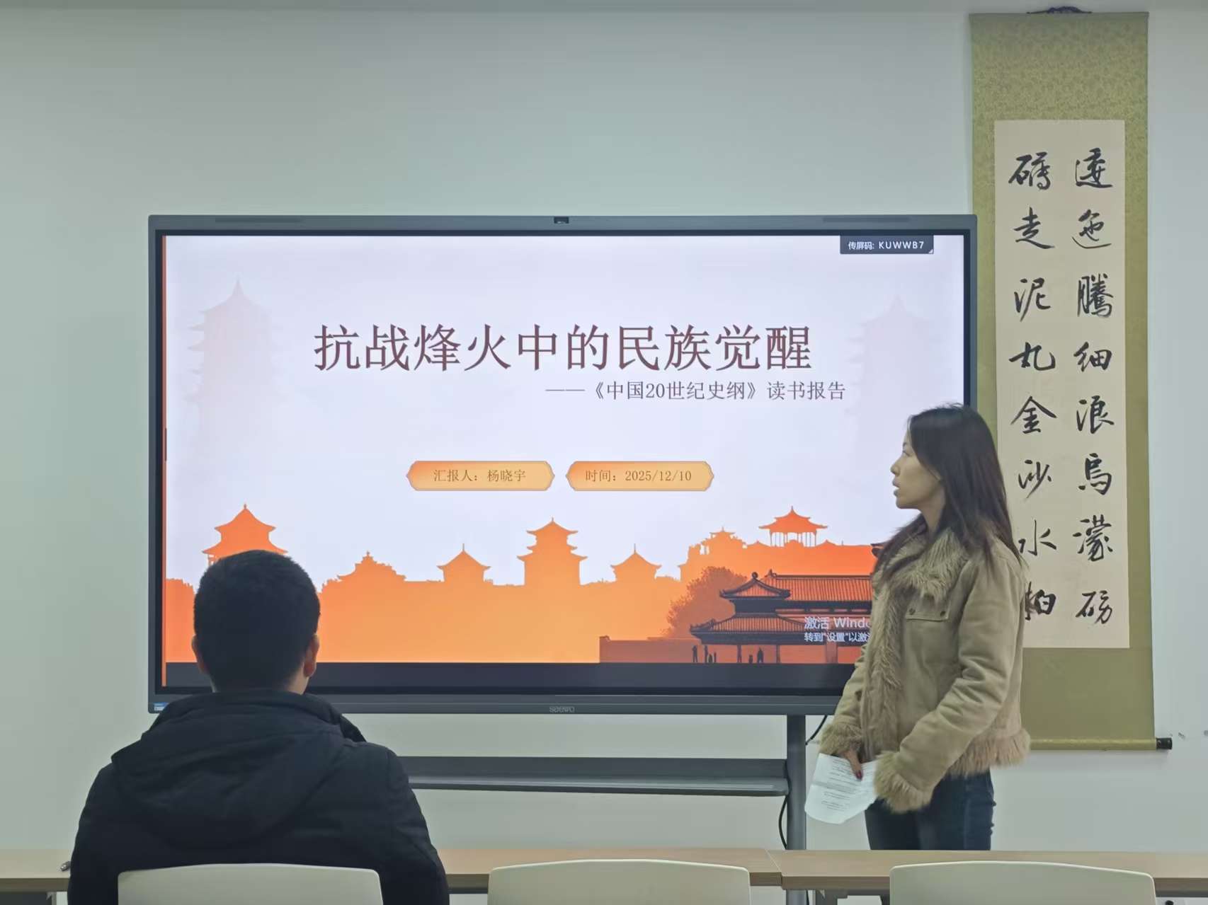杨晓宇同学分享金冲及先生的《二十世纪中国史纲》,她提到那些仁人义士的壮举,那些激动人心的场景,那些跌宕坎坷的遭际,清楚、自然、真实地展现在她眼前,引导她体会抗战中中国人民可歌可泣的民族情怀,体会那时共产党人的睿智眼光、宏伟心胸。今年距离抗日战争胜利已过去八十年,我们现代人已经拥有了越来越完善的社会保障,享受着安全自由的成长空间,使用着各种先进的技术和设备,国家也有越来越坚实的主权保障,因此,我们更应常怀感激,并以此激励自身,为国家的持续发展与和平未来承担起应有的责任。