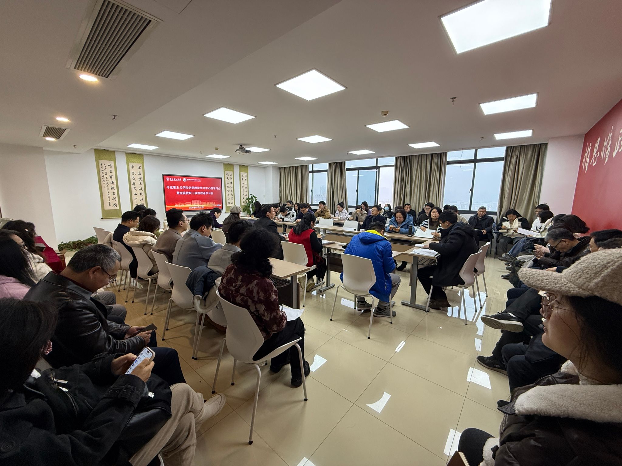 1 月 21 日,马克思主义学院举行党委理论学习中心组专题学习会,深入学习习近平总书记在中共中央政治局民主生活会上的重要讲话精神、在全国政协新年茶话会上的重要讲话精神和二〇二六年新年贺词精神,学习习近平总书记在中央经济工作会议上的重要讲话精神、重要文章《扩大内需是战略之举》《学习好贯彻好党的二十届四中全会精神》,同时专题学习 2026 年全国宣传部长会议精神和全国教育工作会议精神,紧扣学院发展实际交流学习体会、谋划工作思路。