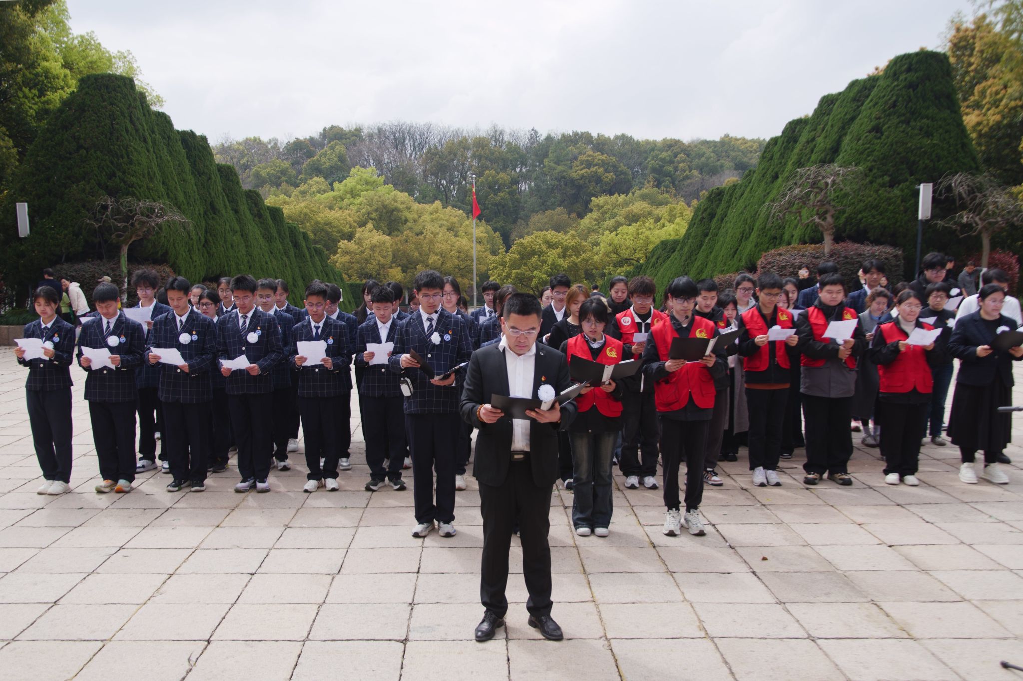 上午10时,主题活动在雄壮激昂的国歌声中正式启幕,杭州市钱塘高级中学学生处副主任、团委书记沈佳平老师主持活动。两校师生代表身着整齐服装,肃立在革命烈士纪念碑前,齐声高唱国歌,激昂的旋律在苍松翠柏间久久回荡,诉说着对英烈的无限崇敬与缅怀。